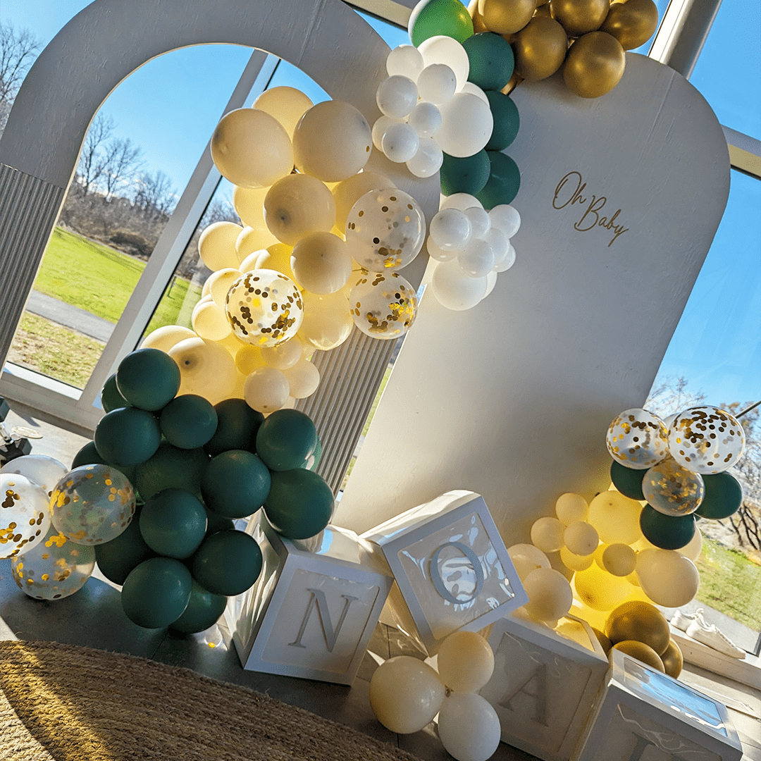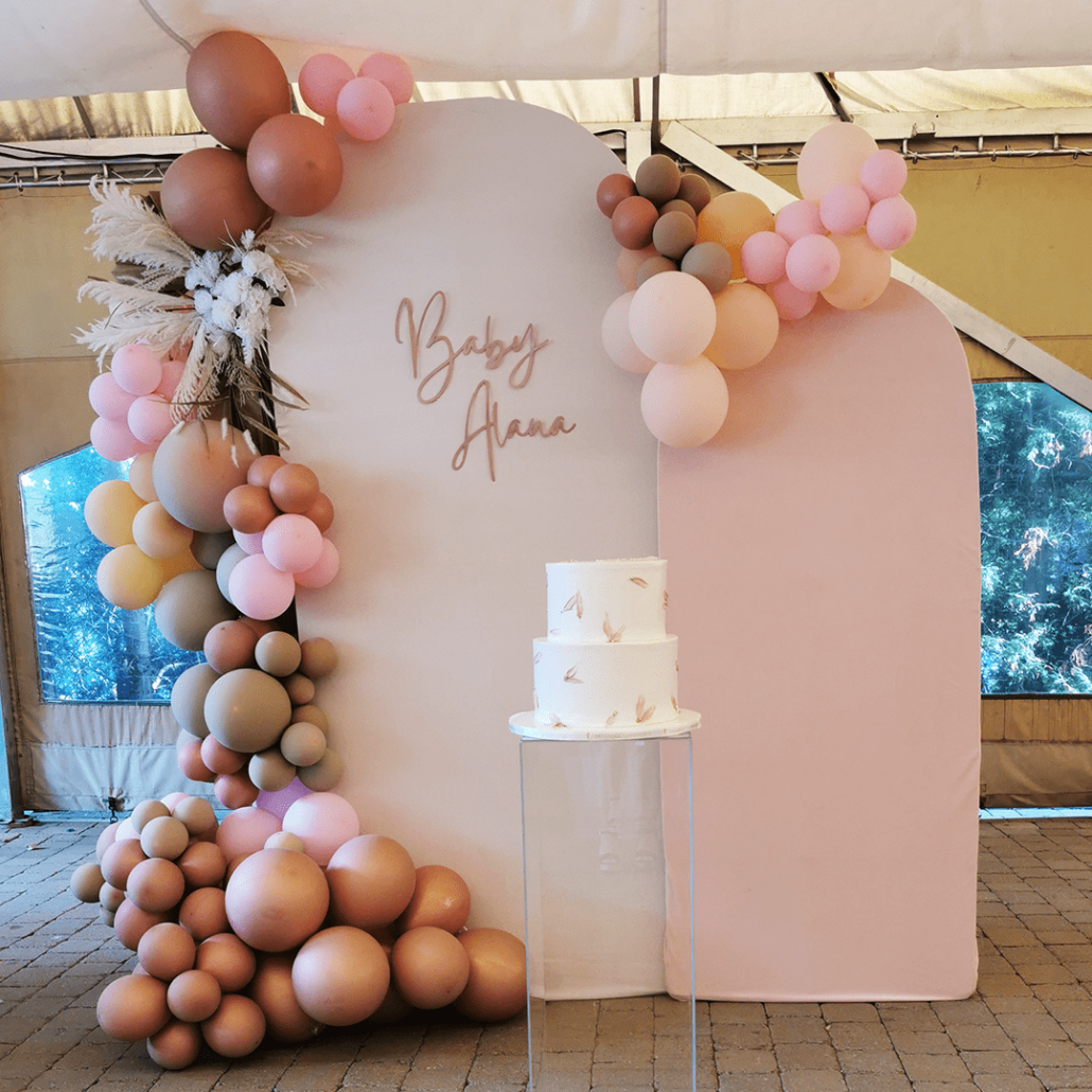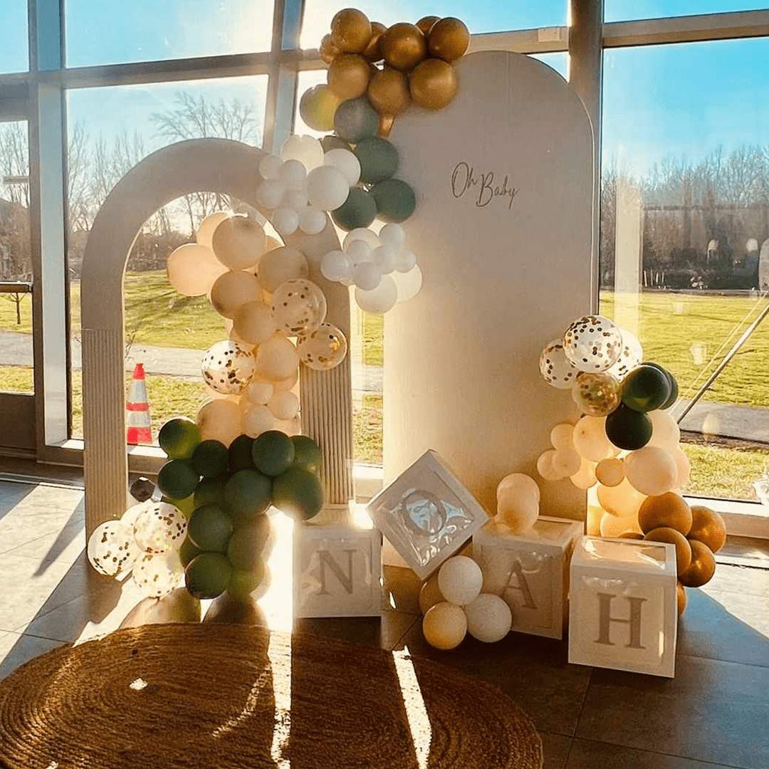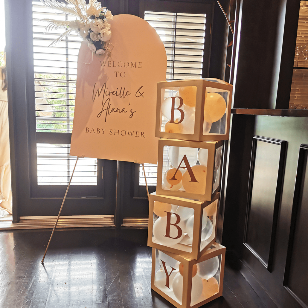 Showering with love. Baby shower decorations, double arc balloons backdrop, centerpieces, favors, seating chart, welcome sign.