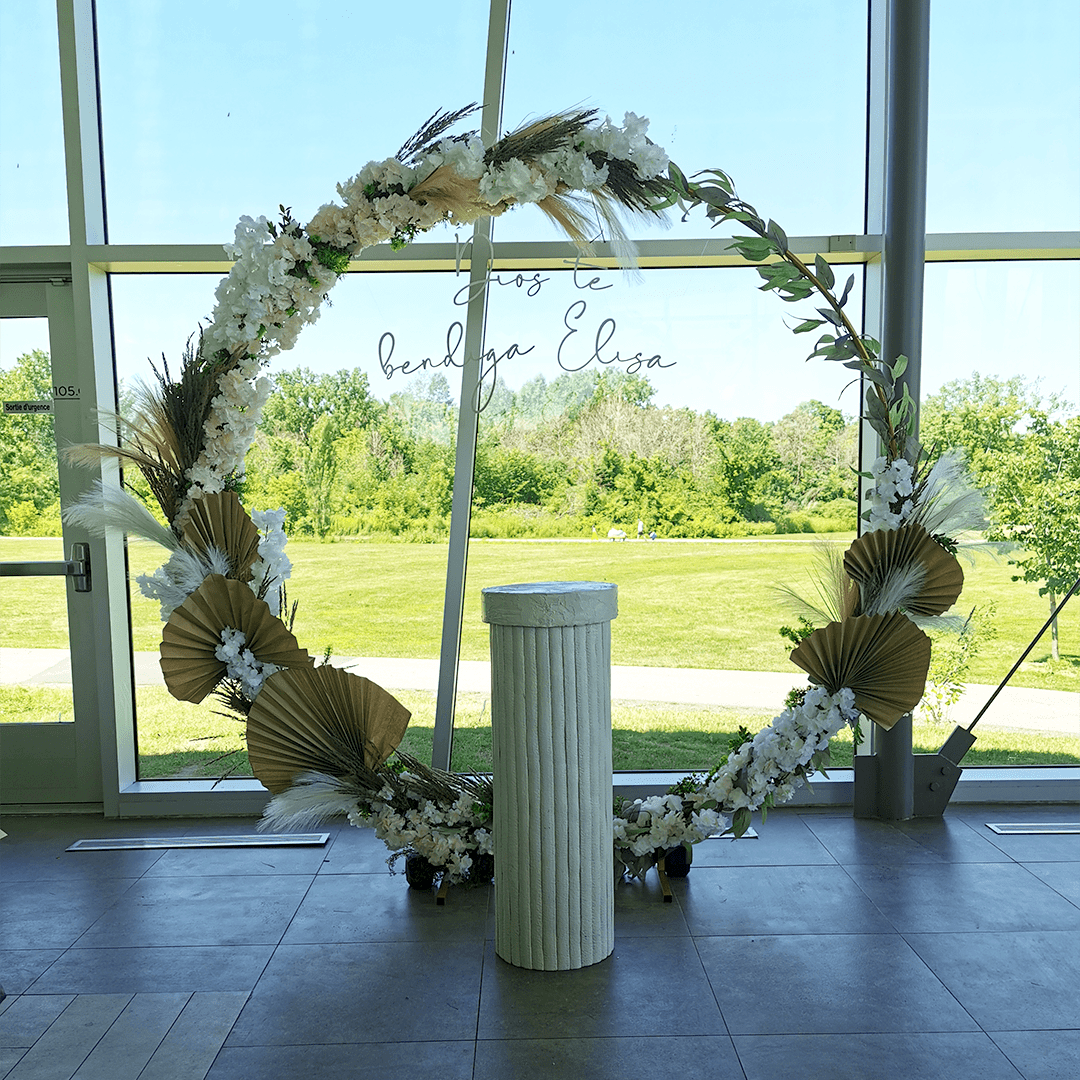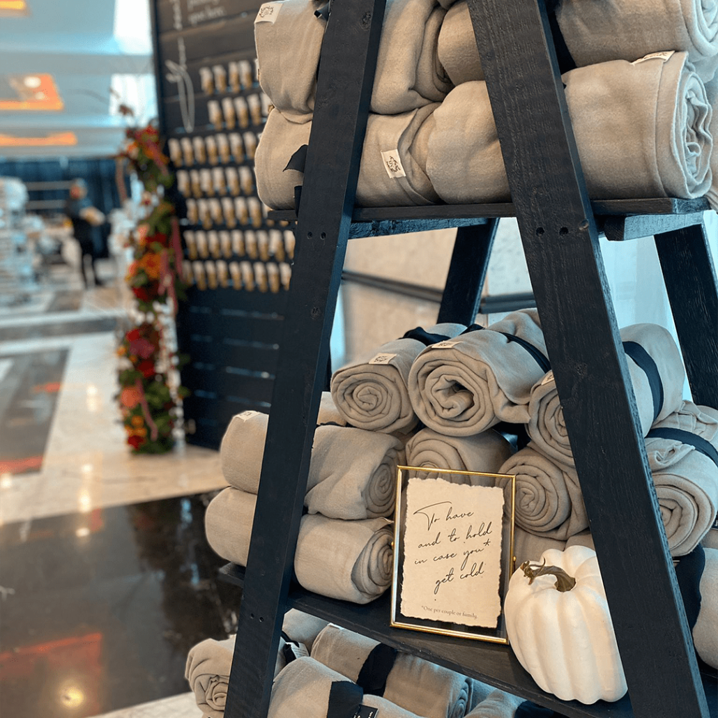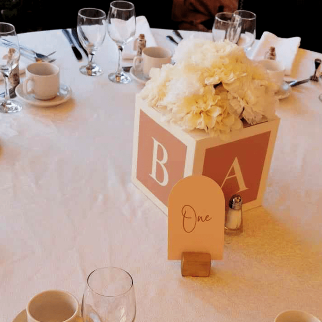 Beautiful wedding with flowers, moon backdrop, custom invitations, menu, seating chart, favors, knit pumpkin, custom letterbox made from scratch, and centerpieces.