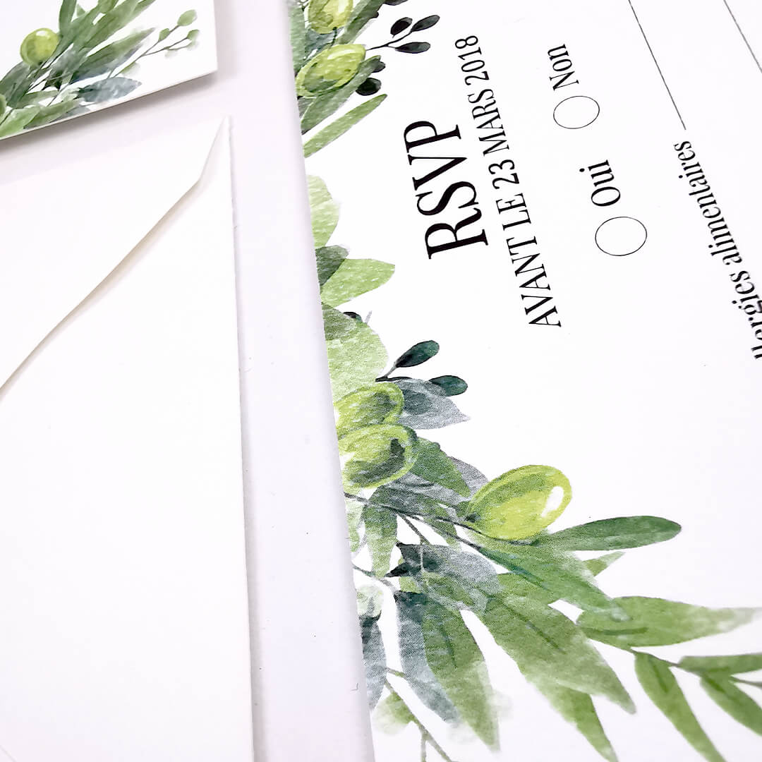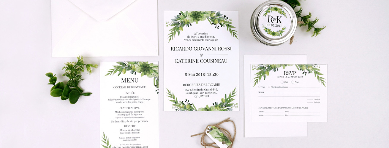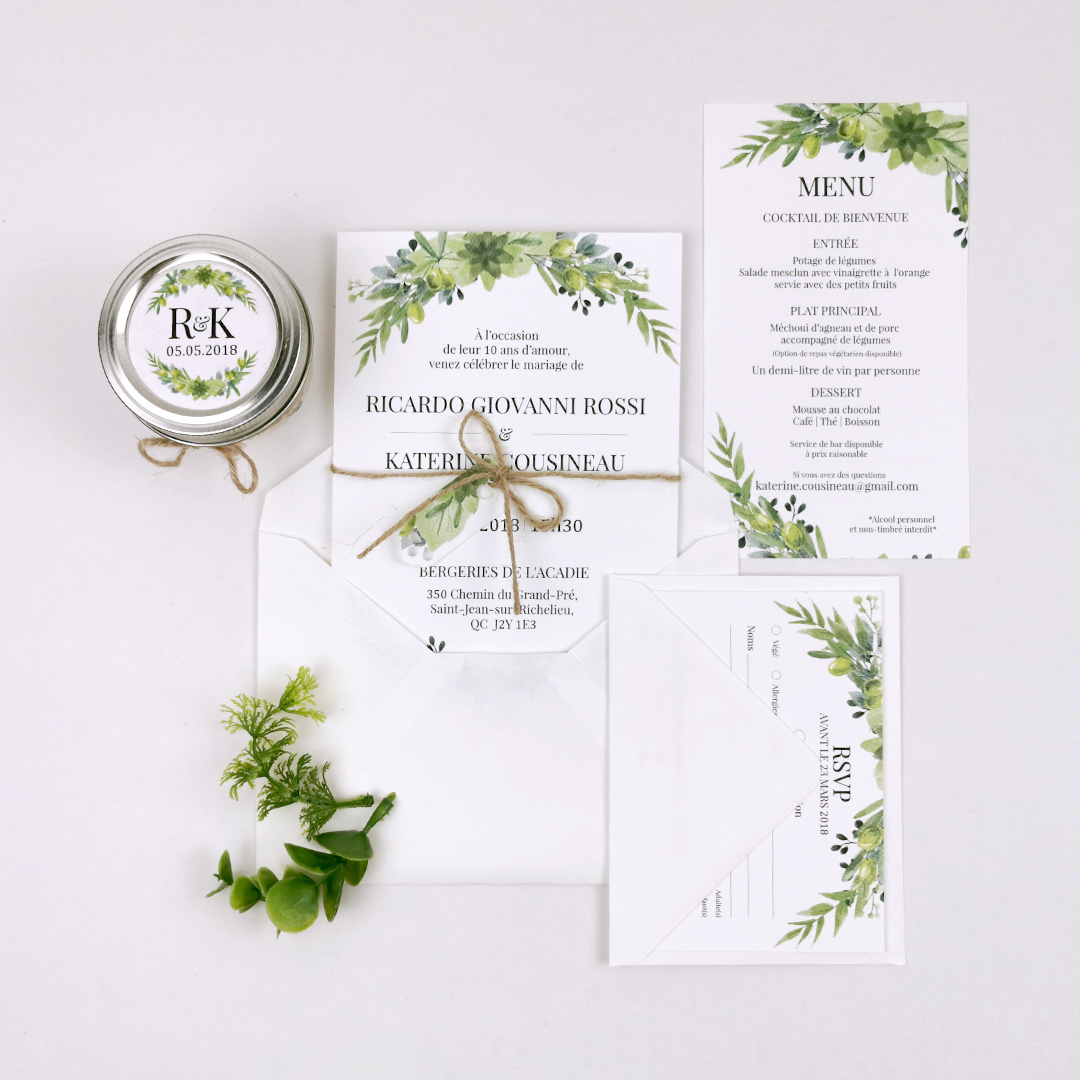 Greenery wedding. Wedding invitation, menu, centerpieces, thank you card.